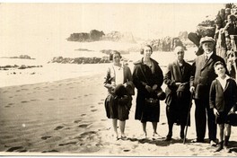Grupo de personas adultas y un niño, aparecen en la fotografía de pie en balneario de Constitución, frente al mar y de espalda a roquerío.