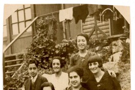 Grupo de mujeres y un adolescente, aparecen en la fotografía sentados en la entrada de una casa de madera en San Antonio.