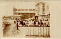 Grupo numeroso de niñas, aparecen fotografiadas a un costado de la "Iglesia del Niño Jesús" o comúnmente llamada "Iglesia del diablo" en Cartagena.