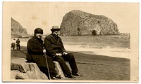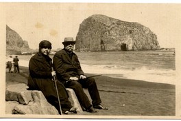 Mujer y hombre adultos, ambos con sombrero y bastones de apoyo, aparecen en la fotografía sentados en una roca. De fondo, la "Piedra de la Iglesia" de balneario de Constitución.
