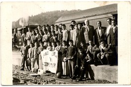 Fotografía de estudiantes y algunos adultos, junto a la vía férrea de la Estación de trenes de Constitución. Varios de los jovenes sostienen un lienzo donde se lee "Federación [...] Constitución". Todos sostienen en sus manos pequeñas chupallas, y además aparecen junto a dos embarcaciones a escala y pelotas de plástico que están en el suelo. Uno de los estudiantes, sostiene una cámara fotográfica. Tras los retratados, se observan trenes, y al fondo, una colina boscosa.