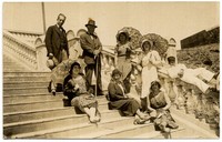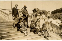 Mujeres con y sin sombrilla, aparecen en la fotografía junto a dos hombres mayores, en una escalera ancha, en la que además se observa a un niño recostado en uno de los tramos.