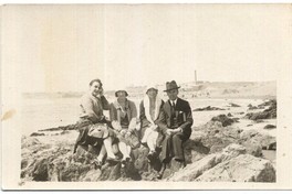 Tres mujeres y un hombre adultos, aparecen en la fotografía sentados en un roquerío de balneario de Pichilemu. Al fondo, se observa a los bañistas y algunas construcciones de ese balneario.
