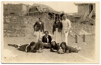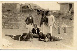 En la fotografía, grupo de mujeres y hombres de pie y recostados en balneario de Pichilemu. Tras ellos, se observa una construcción de piedra con una escalera que solamente tiene barandas y no escalones. Una de las mujeres retratadas, abraza a un perro pequeño.