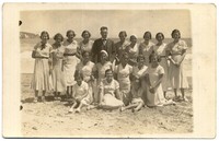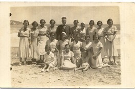 En el centro de la fotografía, aparece un hombre con humita y de pie rodeado de mujeres y dos niñas, que también aparecen de pie o sentadas y de espalda al mar, con vestidos de colores claros, en balneario de Pichilemu.