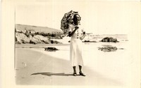 [Mujer con sombrilla de pie en balneario de Pichilemu] [fotografía]. Pichilemu : [entre 1930 y 1940]. 1fotografía : monocromo, gelatina sobre papel fibra ; 9 x 14 cm .