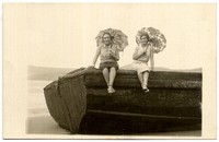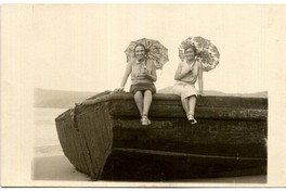 [Dos mujeres con sombrilla sobre embarcación varada] [fotografía].