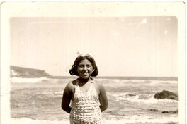 [Niña en roquerío de balneario de Pichilemu junto a un perro] [fotografía]. Pichilemu : 1943. 1 fotografía : monocromo, gelatina sobre papel fibra ; 14 x 9 cm .