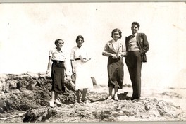 Tres mujeres con abanicos cerrados, aparecen en la fotografía junto a un hombre y sobre roquerío de balneario de Pichilemu.