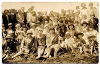 Mujeres con sombreros, un niño de pecho levantado por una de ellas, hombres con boinas, jovenes y niños, aparecen en la fotografía en balneario de Constitución.