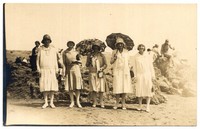 [Mujeres con sombrilla en balneario] [fotografía]. Pichilemu : [entre 1910 y 1920]. 1 fotografía : monocromo, gelatina sobre papel fibra ; 9 x 14 cm .