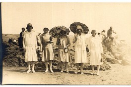Grupo de cinco mujeres con sombreros, dos de las cuales sostienen sombrillas, aparecen en la fotografía en sector rocoso de balneario de Pichilemu.