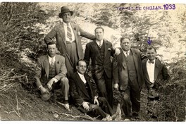 Seis hombres adultos, aparecen en la fotografía en medio de la vegetación de las Termas de Chillán, según se lee en el timbre impreso en ella.