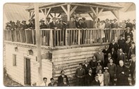 Multitud aparece en la fotografía alrededor de una construcción de madera de dos pisos. Las personas se ubican en la baranda del segundo piso y también en las escaleras, entre ellas, adultos y niños de ambos sexos y también un religioso. Aparece en un pilar de madera un cartel donde se lee "Recinto 30 klm. Buich".