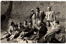 [Grupo de personas alrededor de hombre que lee en voz alta en Termas de Chillán] [fotografía] / [Fotografía de Francisco Bley]. Chillán : [1949]. 1 fotografía : monocromo, gelatina sobre papel fibra ; 9 x 14 cm .