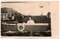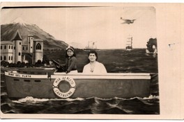 Mujer adulta y niña, aparecen en la fotografía detrás de la embarcación "Mar del Plata Cartagena", correspondiente a un telón de fondo utilizado por el fotógrafo minutero, en el que además se observan otras embarcaciones, una avioneta, un volcán y un castillo pintado.