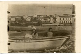 Niña y niño aparecen en la fotografía detrás de embarcación "Cartagena", pintada como parte de un paisaje en telón de fondo utilizado por el fotógrafo minutero, en el que además se observa parte del balneario, el mirador y las construcciones del balneario de Cartagena, en una de las cuales se lee "Gran Hotel Francia". Al costado derecho de la fotografía, y fuera del telón, se puede ver parte de una construcción.