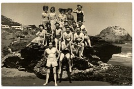 [Personas sobre roquerío en balneario de Pelluhue] [fotografía]. Pelluhue : [entre 1940 y 1950]. 1 fotografía : monocromo, gelatina sobre papel fibra ; 9 x 14 cm. .