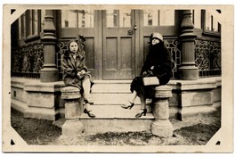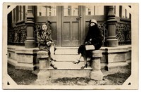 Dos mujeres con abrigo, y una de ellas con sombrero, aparecen en la fotografía sentadas al borde de escalinata de entrada a una casa en Punta Arenas. En el centro de la fotografía, se observa la puerta de entrada con candado.