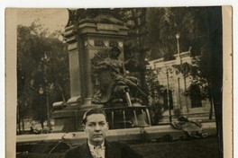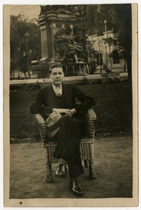 [Hombre sentado en sillón de mimbre a un costado de la fuente de agua de la plaza Vicuña Mackenna] [fotografía]. Santiago : 1933. 1 fotografía : monocromo, gelatina sobre papel fibra ; 13 x 9 cm. .