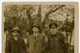Dos hombres con abrigo y sombrero, aparecen en la fotografía junto a uniformado de la Marina en un parque no identificado de Iquique.