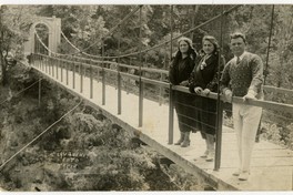 [Dos mujeres y un hombre en puente colgante de Termas de Cauquenes] [fotografía].