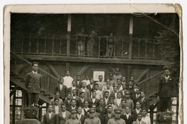 En primera fila se observa en la fotografía a tres uniformados con sables y de espalda: capitán E. Arancibia y el comandante Kurt Von Nagen junto a un grupo de reservistas que aparecen de pie en una escalera ancha que luego se divide en dos tramos opuestos; a los costados, dos hombres de pie sobre plinto de concreto adornado con maseteros con flores. En el segundo piso, y apoyados en una baranda de madera, tres soldados observan desde lo alto la escena.