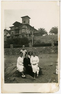 Dos mujeres adultas vestidas de blanco que tienen en su ropa un prendedor, y que aparentemente son enfermeras, aparecen en la fotografía junto a mujer, también adulta, vestida de negro y con quién están sentadas junto a una joven y a una niña en una roca frente a construcción de madera y piedra, y con una torre donde se lee "[Rits?] Hotel".