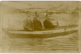 Tres hombres aparecen en la fotografía detrás de bote en el que se lee "Torpederas", pintado en telón de fondo, en el que además se observa un muelle y una embarcación de fondo.