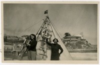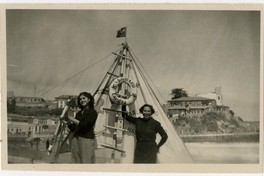 Dos mujeres aparecen en la fotografía en la cubierta de un velero, en el que se lee en el salvavidas "Balneario-Cartagena" y que pende del mástil, junto con una escalerilla. Una de las mujeres sujeta el timón. De fondo, las construcciones de ese balneario.