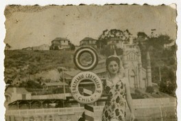 Mujer joven con traje de baño, aparece en la fotografía sobre una imitación de ancla en la que pende un salvavidas donde se lee "Balneario Cartagena Chile 1948". De fondo, el mirador del balneario, la Iglesia del Niño Jesús y algunas construcciones de esa localidad.