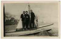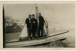 Una mujer y dos hombres adultos, aparecen en la fotografía de pie al interior de bote de madera "El Caleuche Cartagena P.R.1". De fondo, algunas casas de ese balneario.