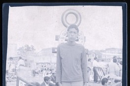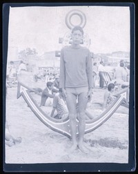 [Joven delante de imitación de ancla en balneario] [fotografía].