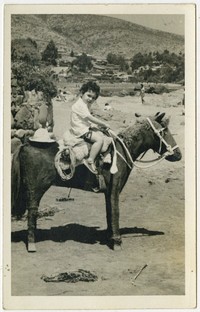 [Niño sobre poni de utilería en balneario de Papudo] [fotografía]. Papudo, Chile : [entre 1950 y 1960]. 1 fotografía : monocromo, gelatina sobre papel fibra ; 14 x 9 cm .