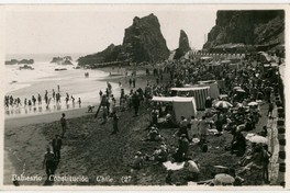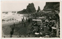 Vista al balneario de Constitución, [playa Las Termopilas] en el que se observa a los veraneantes, las tiendas del lugar, y de fondo, la Piedra de las Termópilas.