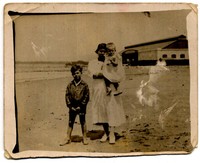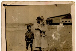 Mujer adulta, aparece en la fotografía con niño de meses en los brazos y junto a niño pequeño en balneario de San Antonio. De fondo, se observa una construcción amplia.
