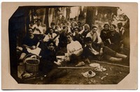 Grupo de personas aparecen en la fotografía en día de picnic en Barrancas de Pirque. Se observa diversos objetos, como una canasta de mimbre, loza, y varas de apoyo. Entre las personas retratadas, aparece un guitarrista.