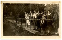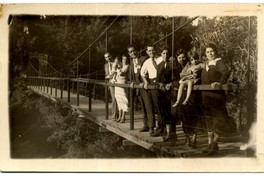 Grupo familiar compuesto por adultos y niños, aparece en la fotografía sobre un puente colgante de madera y fierro, y uno de cuyos extremos presenta forma de arco, y que se encuentra entre dos montes con frondosa vegetación en las Termas de Cauquenes.