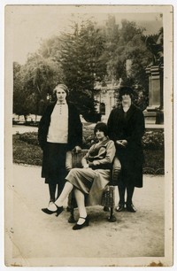 [Mujeres con sombreros en los jardines la plza Vicuña Mackenna a un costado del Cerro Santa Lucía] [fotografía]. Santiago : Casa Hans Frey, 1931. 1 fotografía : monocromo, gelatina sobre papel fibra ; 14 x 9 cm. .