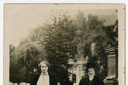 [Mujeres con sombreros en los jardines la plza Vicuña Mackenna a un costado del Cerro Santa Lucía] [fotografía].