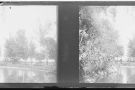 Monocromas estereoscópicas en que se inmortaliza el estanque de la plaza de Valdivia del Cerro Santa Lucía, rodeado por arboleda en una orilla y una reja en la otra, se ven dos figuras humanas.