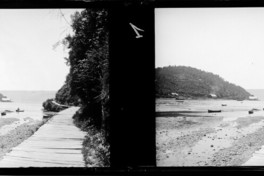 Monocromas estereoscópicas en que se inmortaliza el camino a la Bahía de Corral de Valdivia, piedras del río, algunos botes, una persona y a la derecha, borde de la bahía, camino entablado con algunos paseantes.