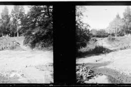 Monocromas estereoscópicas en que se inmortaliza paisaje natural con arboles por el camino, vista del río Angachilla con un bote hundido en la orilla, vista de una parte del río en donde aparece un pequeño puente visto de frente.