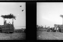 Monocromas estereoscópicas en que se inmortaliza carreta tirada por bueyes con techo de hojas, cargando trigo de la trilla, tres personas arriba de la carreta, dos personas abajo y delante, Tres jinetes con sus caballos, una mujer y dos hombres, al costado una carreta con bueyes.