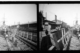 [Muelle y embarcaciones en dique seco en Talcahuano] [fotografía] / Julio Bertrand Vidal. Talcahuano, 1907 3 fotografías sobre placa de vidrio : monocroma estereoscópica ; 4,4 x 10,7 cm. .