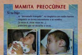 Mamita preocúpate si tu hijo... es "demasiado tranquilo", no despierta con ruidos fuertes... responde en forma intermitente a su nombre (a veces si, otras veces no...)... pareciera que no escucha a veces... [estampa] : Santiago, Chile : [Editor no identificado], [199-?]. 1 cartel (afiche) : color ; 42 x 31 cm. .