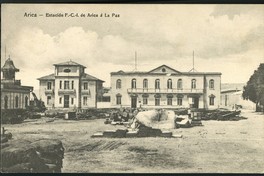 Arica-Estación del F. C. I de Arica á La Paz : [Ubicado junto al edificio de la Ex Aduana] [fotografía]. Arica : A. Morice , Entre 1915 y 1920]. 1 tarjeta postal : fotografía, monocromo, gelatina sobre cartulina ; 14 x 9 cm. .