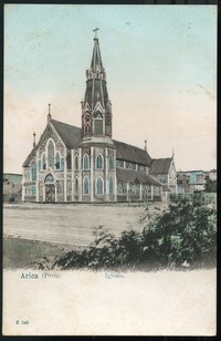 [Catedral de San Marcos de Arica] : Arica (Perú) Iglesia [fotografía] / Eduardo Polack, Editor. Arica : Eduardo Polack , [Entre 1899 y 1909]. 1 tarjeta postal : colotipo, fotomecánico policromo sobre papel ; 9 x 14 cm. .