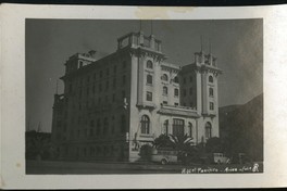 Hotel Pacífico, Arica [Automóviles y un Transporte de Pan American-Grace Airways-Grace Inc Grace PAA (Línea Aérea PANAGRA), estacionados en la puerta] [fotografía] / Foto R. Arica : Foto R., [entre 1930 y 1935]. 1 tarjeta postal : fotografía, monocromo, gelatina sobre cartulina ; 14 x 9 cm. .