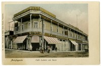 Antofagasta, Calle Latorre con Sucre [Tienda y Bazar "La Villa de Madrid", Cortina Pis y Ca., de propiedad de Emilio Pis, de nacionalidad española, "Wing Jong Kee y Ca." y el "Victoria Hotel"] [fotografía] / Carlos Brandt. Antofagasta : Carlos Brandt , [Entre 1900 y 1909]. 1 tarjeta postal : colotipo, fotomecánico policromo sobre papel ; 13,8 x 8 cm. .